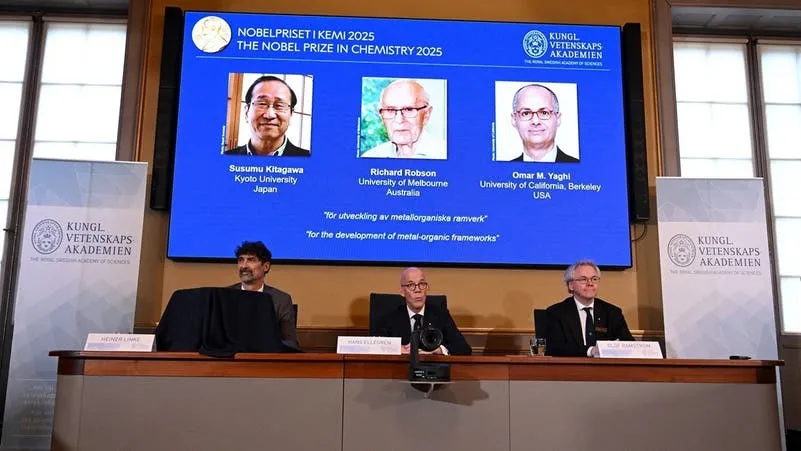 رائل سویڈش اکیڈمی آف سائنسز نے 2025 کے نوبیل انعام برائے کیمسٹری کا اعلان کر دیا ہے۔ یہ معتبر انعام تین سائنسدانوں—رچرڈ رابنسن (آسٹریلیا)، سوسومو کیٹاگاوا (جاپان) اور اردنی نژاد امریکی سائنسدان عمر یاگل—کو مشترکہ طور پر دیا گیا ہے۔ تینوں محققین نے میٹل آرگینک فریم ورک (Metal-Organic Frameworks) پر گراں قدر سائنسی کام کیا، جو جدید کیمیائی انجینئرنگ میں انقلاب کا سبب بن رہا ہے۔