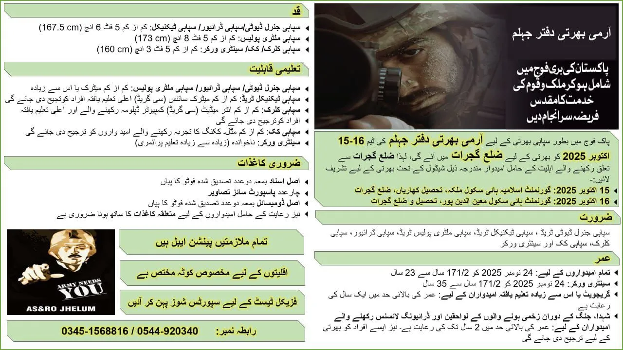 پاک فوج میں بطور سپاہی بھرتی کے خواہشمند نوجوانوں کے لیے خوشخبری ہے، رجسٹریشن کا عمل شروع ہو چکا ہے۔ سلیکشن ٹیم 15 اکتوبر کو گورنمنٹ اسلامیہ ہائی اسکول، ملکہ (تحصیل کھاریاں) اور 16 اکتوبر کو گورنمنٹ ہائی اسکول، معین الدین پور (تحصیل و ضلع گجرات) میں امیدواروں کی رجسٹریشن کرے گی۔