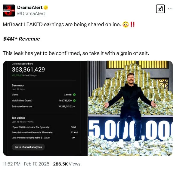 مسٹر بیسٹ کے یوٹیوب چینل پر 36 کروڑ سے زائد سبسکرائبرز ہیں اور ان کی ویڈیوز پر اربوں کی تعداد میں ویوز آتے ہیں۔ حال ہی میں، ایکس (سابقہ ٹوئٹر) پر "ڈرامہ الرٹ” نامی اکاؤنٹ نے مسٹر بیسٹ کی مبینہ آمدنی کا اسکرین شاٹ شیئر کیا، جس کے مطابق ان کی گزشتہ 28 دنوں کی کمائی 40 لاکھ ڈالر (تقریباً 1 ارب 11 کروڑ پاکستانی روپے) سے زائد رہی۔