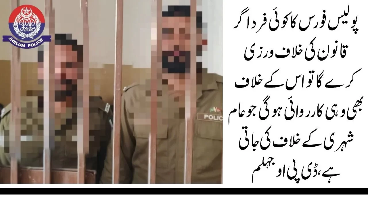 جہلم، ڈسٹرکٹ پولیس آفیسر جہلم طارق عزیز سندھو کی زیرو ٹالرنس پالیسی پر عملدرآمد جاری ہے۔ ٹریفک قوانین کی خلاف ورزی پر تھانہ سول لائنز میں 2 پولیس اہلکاروں کے خلاف مقدمہ درج کر لیا گیا۔