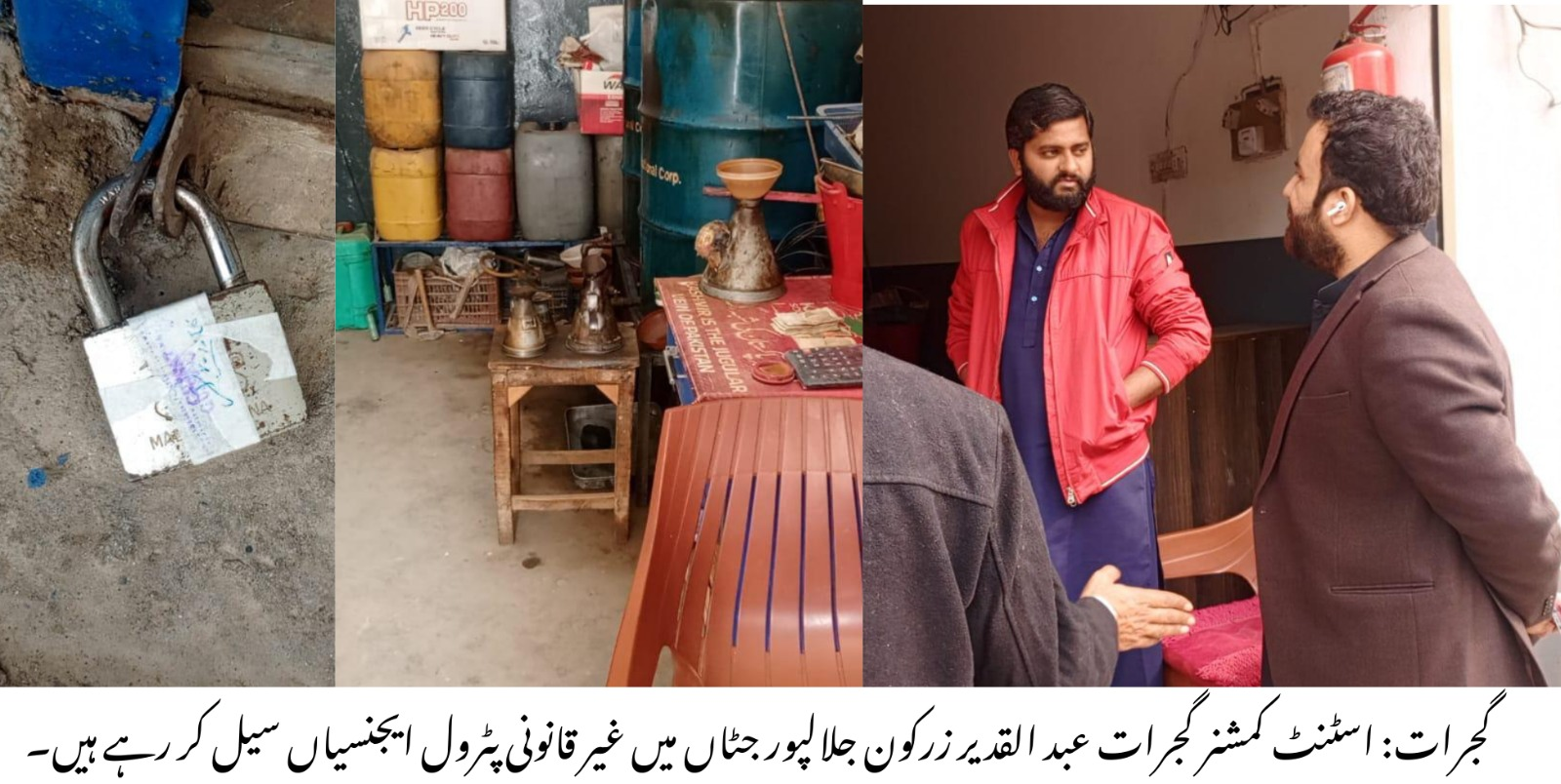 گجرات میں اسسٹنٹ کمشنر عبدالقدیر زرکون نے قانون کی بالادستی اور عوامی تحفظ کو یقینی بنانے کے لیے کارروائی کرتے ہوئے جلالپور جٹاں میں دو غیر قانونی پٹرول ایجنسیاں سیل کر دی ہیں۔