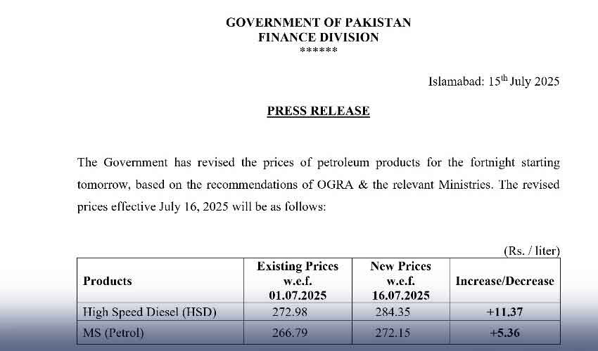 وزارت خزانہ کی جانب سے جاری کردہ نوٹیفکیشن کے مطابق، پیٹرول کی قیمت میں 5 روپے 36 پیسے فی لیٹر اضافہ کیا گیا ہے، جس کے بعد نئی قیمت 272 روپے 15 پیسے فی لیٹر مقرر کی گئی ہے۔ اسی طرح ہائی اسپیڈ ڈیزل کی قیمت میں 11 روپے 37 پیسے کا اضافہ کیا گیا ہے، جس کے بعد اس کی نئی قیمت 284 روپے 35 پیسے فی لیٹر ہو گئی ہے۔