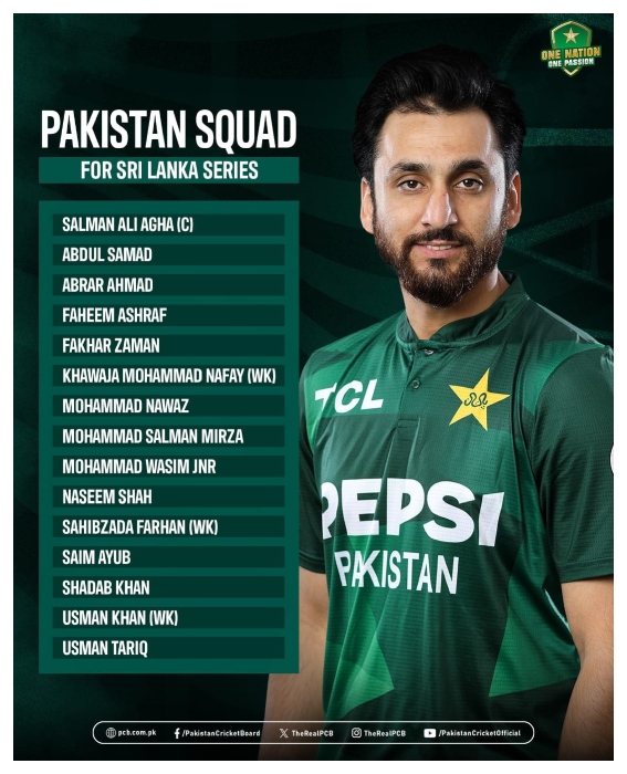 پاکستان کرکٹ بورڈ (پی سی بی) نے سری لنکا کے خلاف آئندہ ٹی ٹوئنٹی انٹرنیشنل سیریز کے لیے قومی کرکٹ ٹیم کے 15 رکنی اسکواڈ کا اعلان کر دیا ہے۔ یہ سیریز نہ صرف دونوں ٹیموں کے درمیان مقابلے کی اہم کڑی سمجھی جا رہی ہے بلکہ آئندہ ٹی ٹوئنٹی ورلڈ کپ کے لیے ممکنہ اسکواڈ کی تشکیل میں بھی مددگار ثابت ہوگی۔