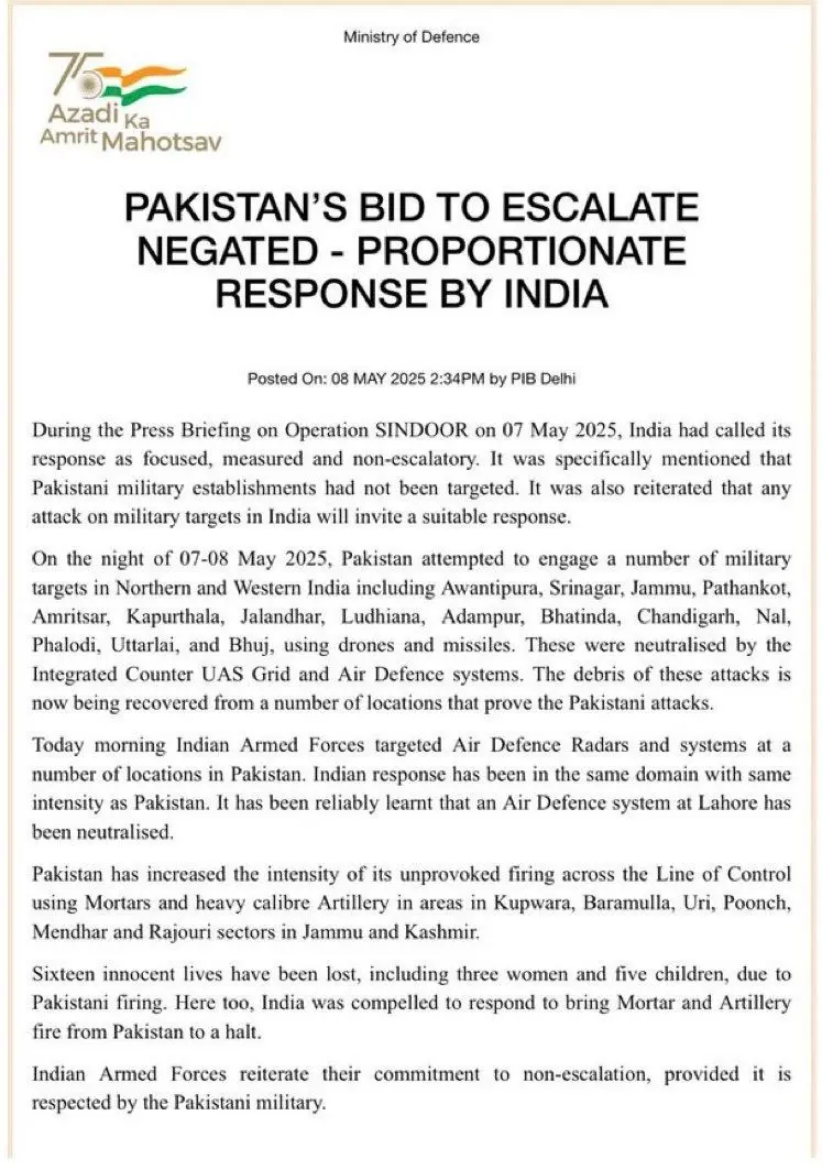 جمعرات کو بھارتی وزارت دفاع کی جانب سے جاری ایک بیان میں کہا گیا کہ 7 اور 8 مئی کی درمیانی شب پاکستان نے بھارتی فوجی تنصیبات کو میزائلوں اور ڈرونز کے ذریعے نشانہ بنانے کی کوشش کی۔ وزارت کے مطابق، ان حملوں کا ہدف بھارت کے شمالی اور مغربی علاقوں میں واقع اہم دفاعی مراکز تھے، جن میں آونتیپورہ، بھٹنڈہ، چندی گڑھ، نال، پھالودی، اترلائی اور بھوج شامل ہیں۔